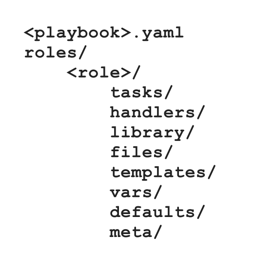 Ansible roles help to standardize an Ansible setup and promote reusability. With roles, we can automatically load var files, handlers, tasks, and other Ansible artifacts using a standard directory structure relative to your playbooks. The directory structure can be seen as follows: