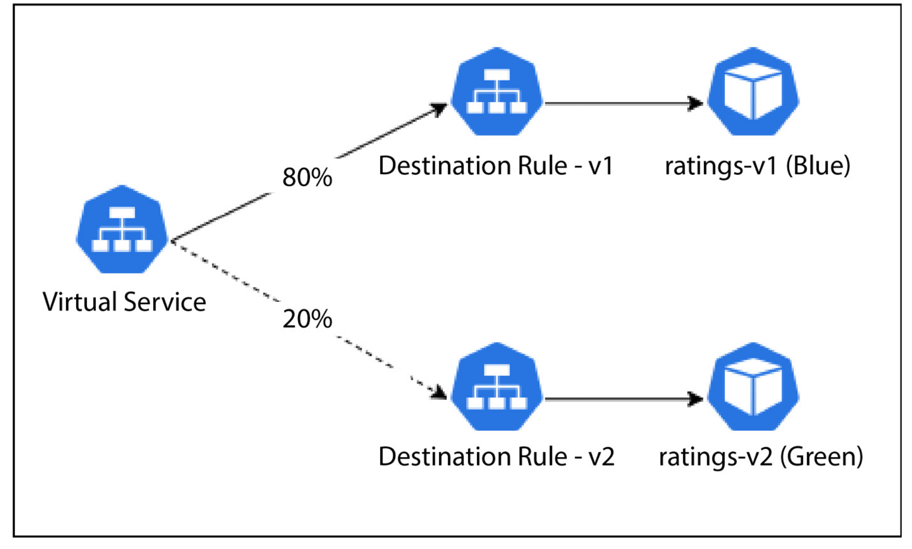 - VirtualService: Directs 70% of traffic to