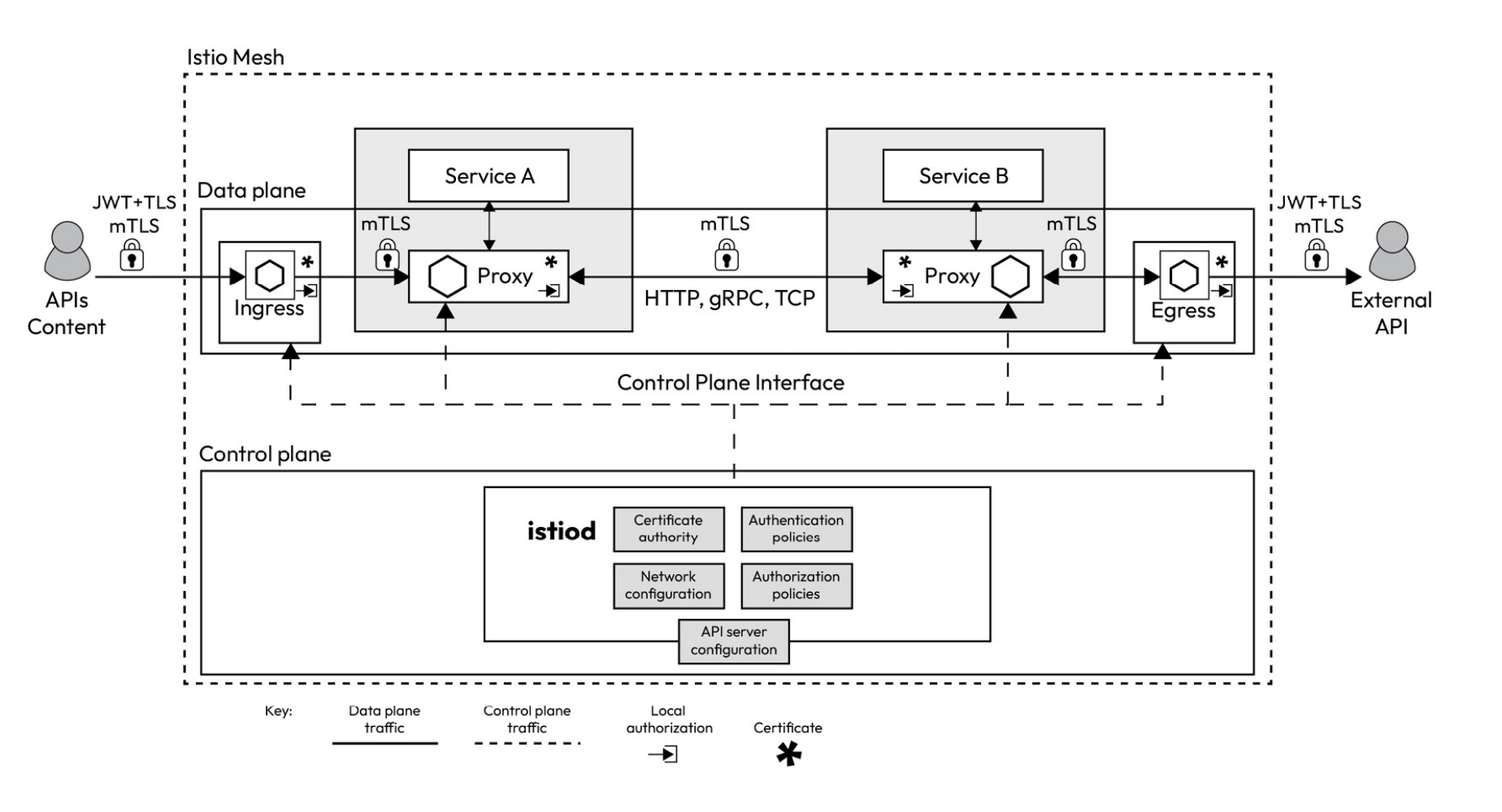 - Citadel focuses on identity and access management within your service mesh, fostering secure communication between Kubernetes pods. It offers user authentication, credential management, certificate handling, and traffic encryption, ensuring pods can securely validate one another when necessary.